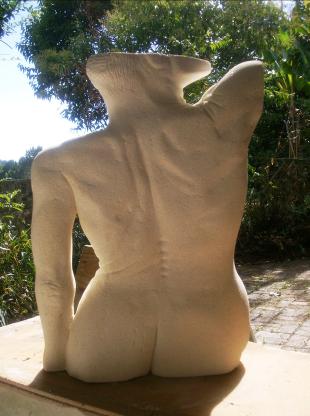 This sculpture has a unique natural defect of rust colour caused by organic matter near the heart giving an appearance of a bleeding perforation.